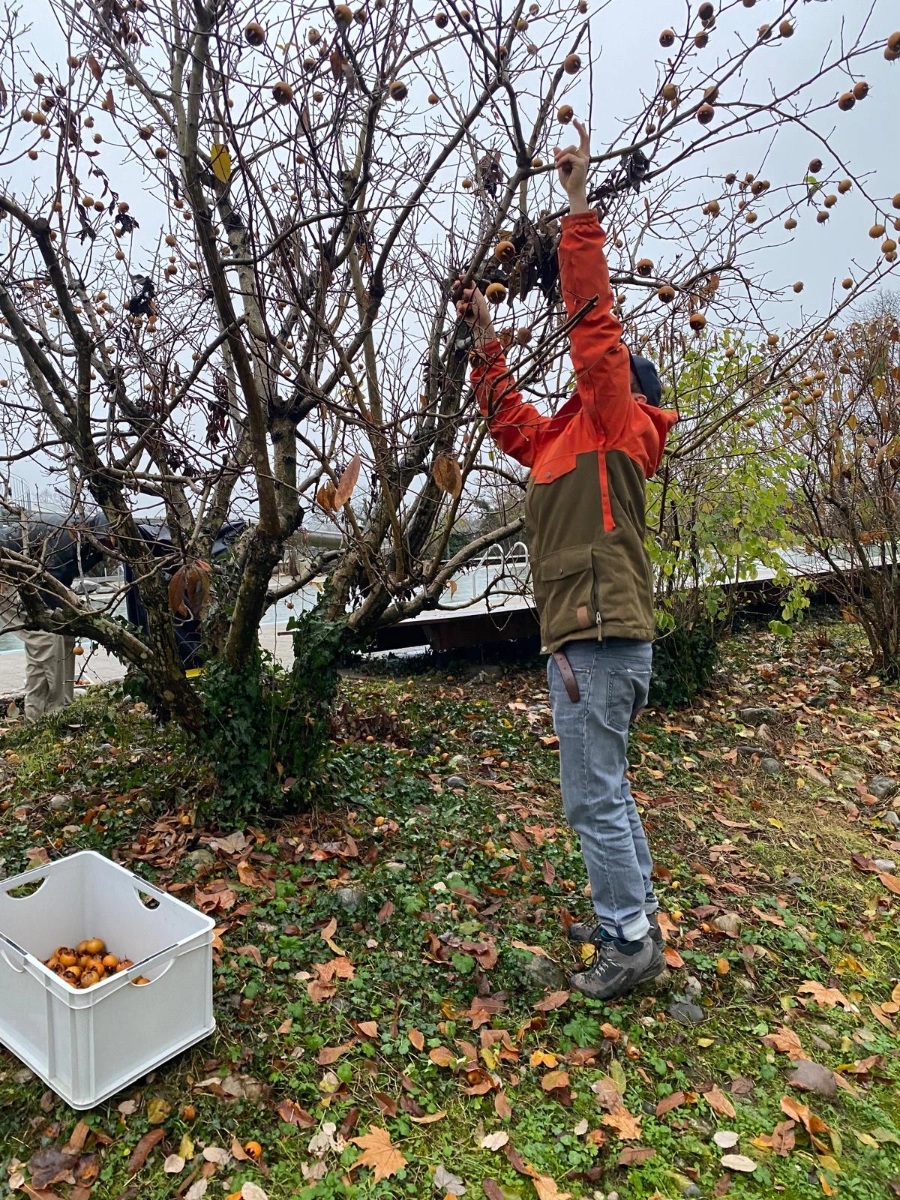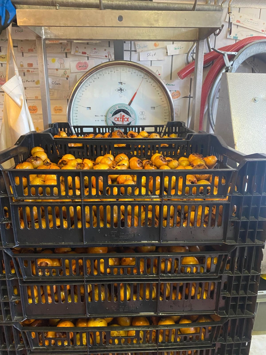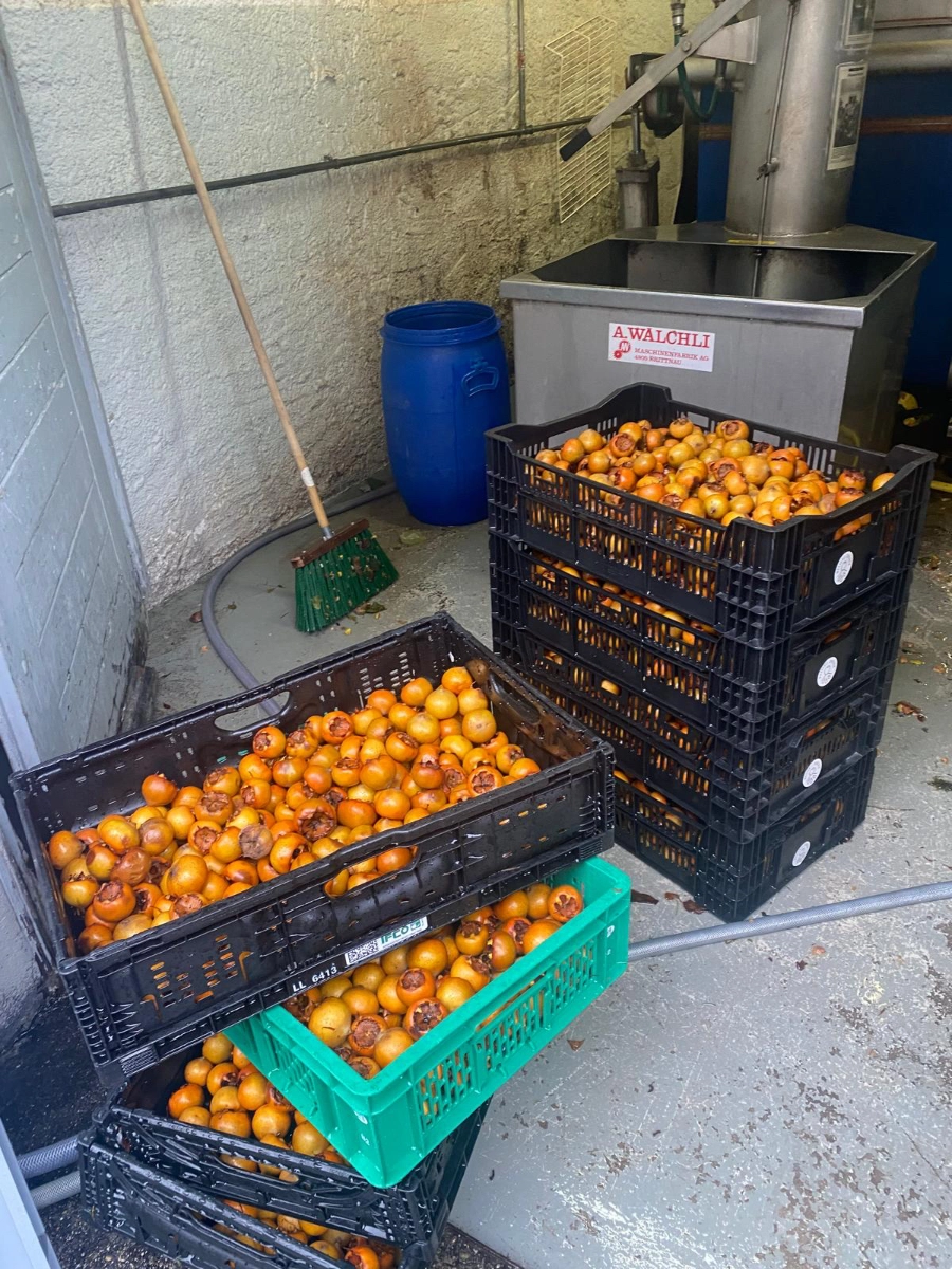Bei garstigen Bedingungen haben ein paar wetterfeste Unentwegte im Schwimmbad 70 kg (!) Mispeln gesammelt. Die Früchte werden in der Mosterei von Felix Schweizer in Zunzgen zu Mus verarbeitet und in Becher abgefüllt.